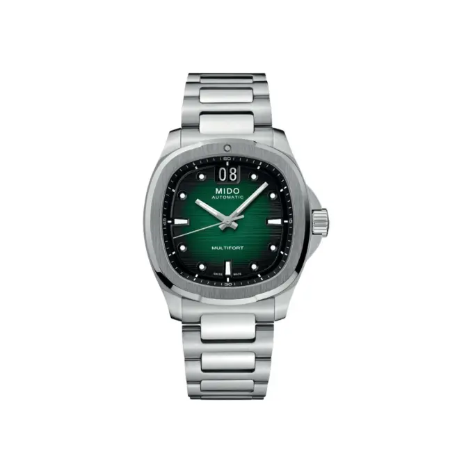 Завершает подборку эксклюзив в форме ретро-телевизора от Mido. Уникальный корпус-подушка из стали марки 316L с сатинированными гранями выделяет эти часы на фоне любых круглых или квадратных моделей. Градиентный циферблат, переходящий от зеленого к черному, выглядит невероятно глубоко, а массивная апертура даты в позиции «12 часов» выступает визитной карточкой коллекции. Циферблат прикрывает сапфировое стекло с антибликовым покрытием, благодаря которому время всегда считывается без проблем.