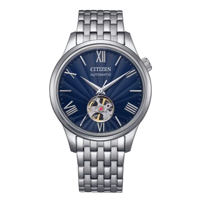 Перед нами японская механика с открытой душой. Главная фича дизайна Citizen Automatic NH9130-84L — окно Open Heart в позиции «6 часов», через которое можно наблюдать за биением баланса автоматического калибра. Глубокий синий циферблат с лучевидной шлифовкой эффектно контрастирует со стальными римскими цифрами и метками. Корпус выполнен из высококачественной стали и прикрыт устойчивым к царапинам сапфировым стеклом.