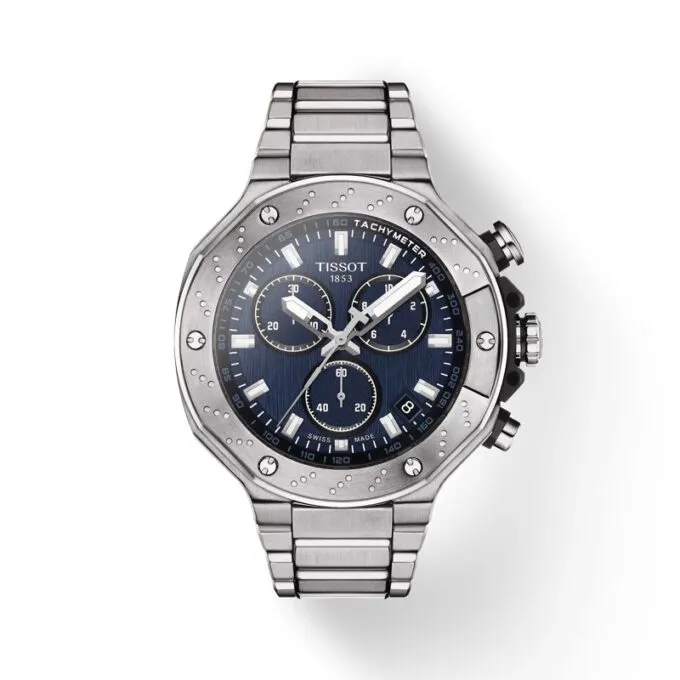 Раз уж заговорили о спорткарах: Tissot T-Race T141.417.11.041.00 — ода мотоспорту. Дизайн модели пропитан духом гонок: безель напоминает тормозной диск, а крепление браслета имитирует детали подвески мотоцикла. Стальной корпус дополнен защитными накладками на заводную головку, а синий циферблат под сапфировым стеклом выглядит агрессивно и технологично. Это тяжелые, заметные часы для тех, кто не боится привлекать внимание.