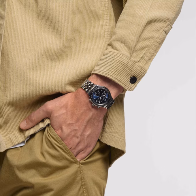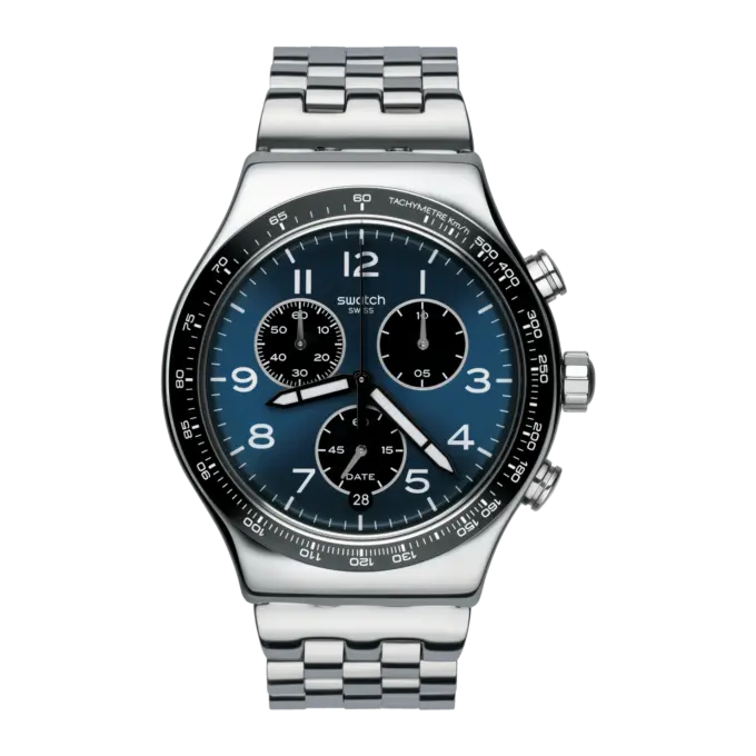 Швейцарская дерзость в металле. Линейка Irony от Swatch ломает стереотип, что у этого бренда только пластиковые часы. В Swatch Boxengasse YVS423GC мы видим массивный корпус из полированной стали и функциональный безель с тахиметрической шкалой. Темно-синий циферблат с арабскими цифрами и контрастными зонами хронографа создает динамичный, спортивный образ, а стальной браслет с надежной застежкой уверенно фиксирует девайс на руке.