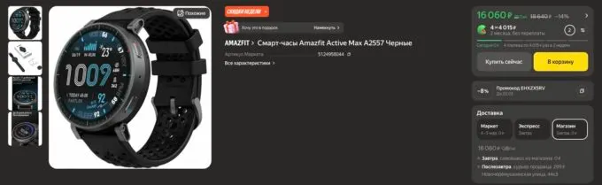 Сейчас на Яндекс Маркете хитовые Amazfit Active Max можно урвать всего за 16 060 рублей. Также не забывайте, что многие банки готовы отсыпать щедрый кэшбек за покупки на этой платформе.