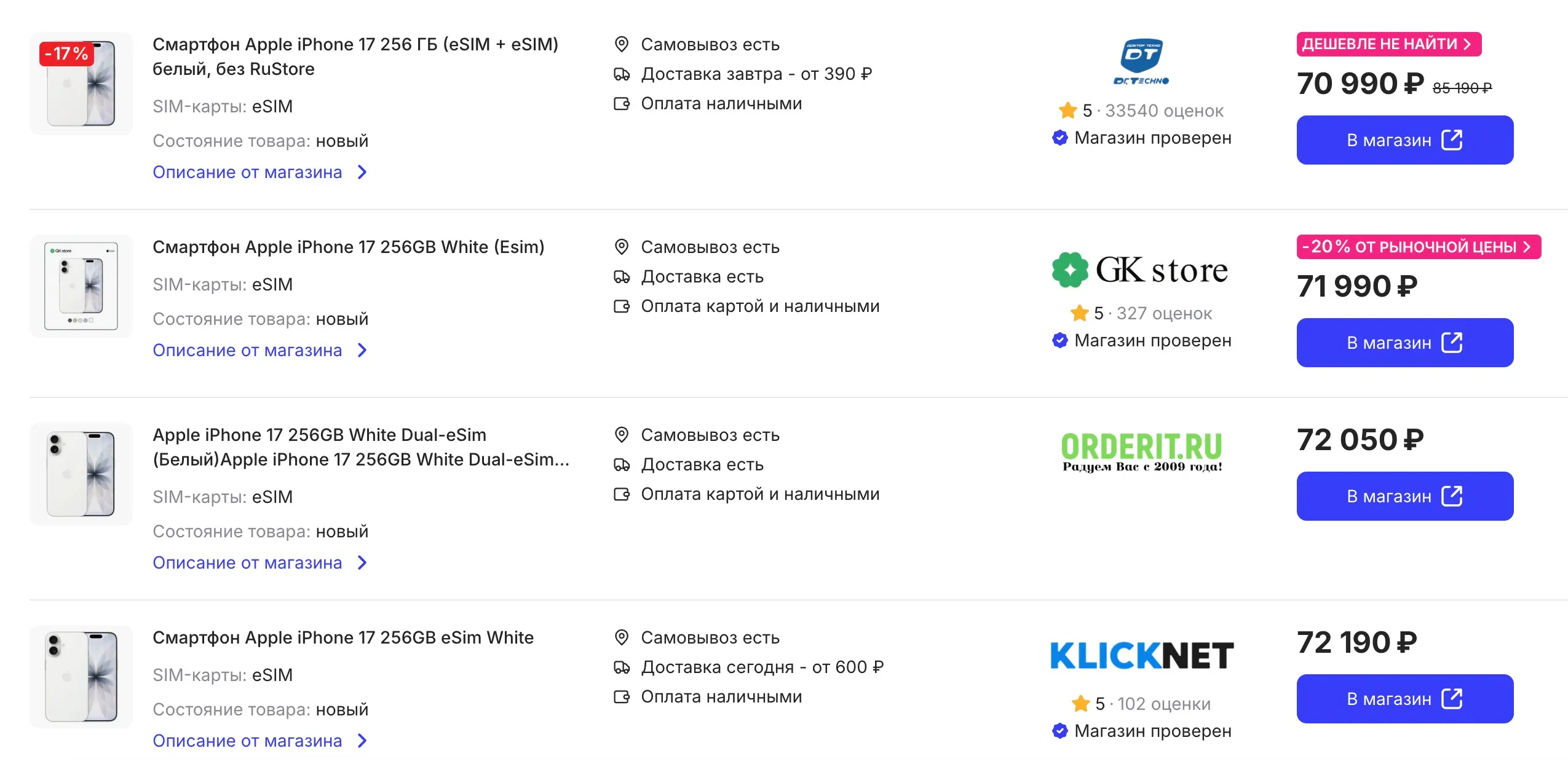 Выход — надо покупать у мелких продавцов, которые держат цены ниже среднего показателя. Скорее всего, iPhone 17 за 65 тысяч рублей, как в феврале, вы не найдете, но цены точно будут ниже. Небольшие магазины имеют сравнительно маленький оборот и в основном берут оплату наличкой. Из-за этого они платят меньше налогов и комиссий банку и могут предлагать конкурентные цены.