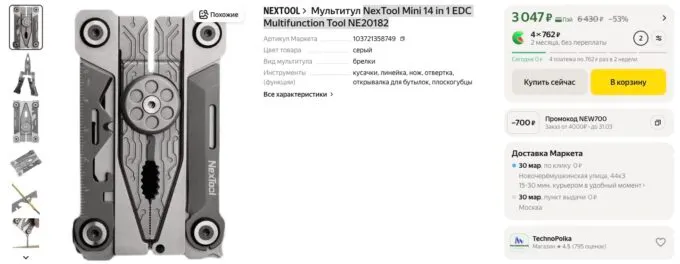 Прямо сейчас лучший микро-мультитул Xiaomi NexTool Mini EDC Credit Card (NE20182) можно урвать на Яндекс Маркете за 3047 рублей, а с кэшбеками некоторых банков он обойдётся ещё дешевле.