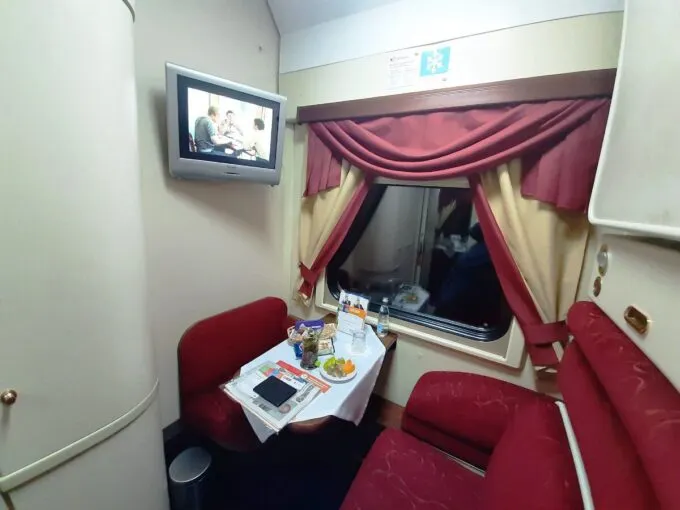 Спальное место — только нижнее. Верхняя полка убрана и не используется. Есть шкаф с умывальником, а в стоимость билета входит горячий завтрак, набор гигиенических принадлежностей и тапки.