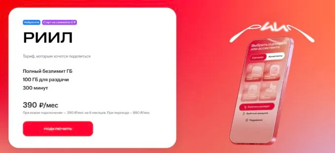 Для старых абонентов и при переходе внутри экосистемы Риил стоит 890 рублей (для московского региона). Для новых клиентов — 390 рублей в месяц на полгода.