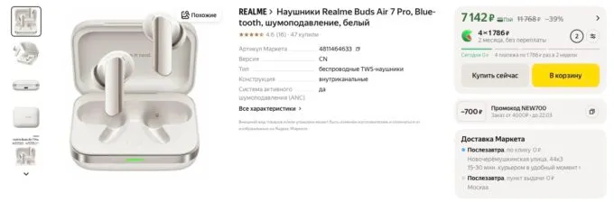 Прямо сейчас на Яндекс Маркете топовые наушники Realme Buds Air 7 Pro можно купить всего за 7142 рубля, а с кэшбеком некоторых банков они обойдутся ещё дешевле.