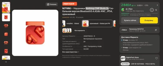 Если вам нужны наушники на каждый день, но вы не готовы тратить больше 3 тысяч, вам стоит присмотреться к CMF Buds 2a. Они получили узнаваемый дизайн с минималистичным квадратным кейсом и колёсиком. На выбор доступны три расцветки.