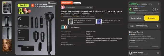Прямо сейчас на Яндекс Маркете стильный фен Tuvio HBI1412 можно урвать всего за 7510 рублей. Также не забывайте, что некоторые банки могут отсыпать кэшбек с покупок на этой платформе.