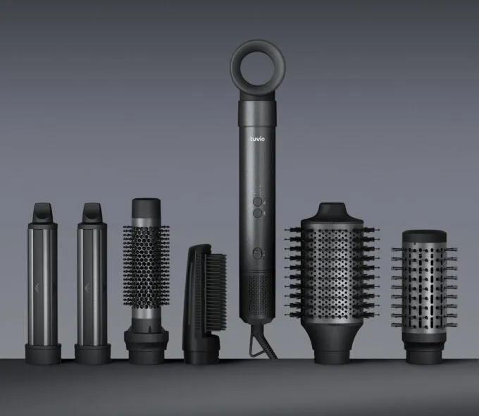 Жирнейший плюс Tuvio HBI1412 — комплектация. Тут идут сразу 7 насадок: концентратор для точечной сушки, щётки разного диаметра для объёма и локонов, а также насадка для выпрямления. За счёт этого стайлер подходит и для быстрой утренней укладки, и для более аккуратной проработки прядей. Ну, а встроенная технология ионизации снимает статическое электричество, делая волосы визуально более гладкими и помогает избежать эффекта распушения после сушки.
