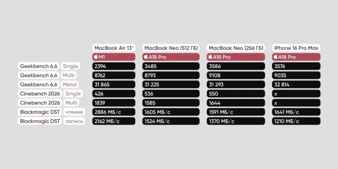 В синтетических тестах Neo не уступает Air на M1. Но диски помедленнее. В субъективном использовании новый MacBook Neo намного быстрее старого Air (сравнивали с только что купленной моделью).