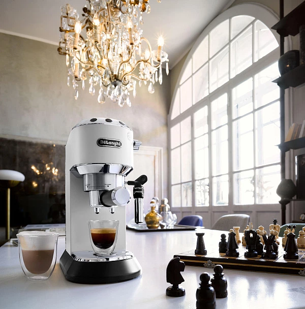 Настоящая легенда, которая в 2026 году остается эталоном в категории узких рожковых кофеварок. DeLonghi Dedica предлагает полностью металлический корпус и итальянскую надёжность, проверенную годами. При давлении в 15 бар она готовит классический, «правильный» эспрессо. Главная фича модели — гибкость настроек: вы можете запрограммировать объем порции, температуру воды и даже жесткость, чтобы машина вовремя напомнила о необходимости очистки от накипи.