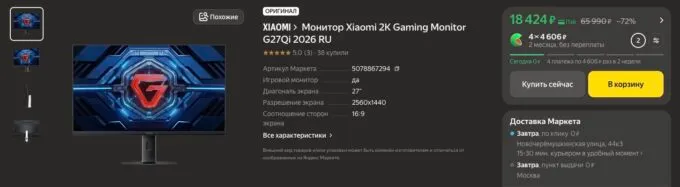 Ещё Xiaomi G27Qi может пофлексить запасом яркости в 400 нит, откликом в 1 мс, точной цветопередачей (95% DCI-P3) и поддержкой HDR. На задней панели расположились два порта DisplayPort 1.4 и пара HDMI 2.0, что позволяет одновременно подключить ПК и консоли. Это один из самых доступных способов получить 2K-гейминг на профессиональном уровне в 2026 году.