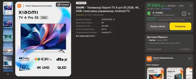 Центральный элемент домашней экосистемы — 55-дюймовый 4K-телевизор Xiaomi TV A Pro с технологией QLED и подсветкой на квантовых точках. Тонкий металлический корпус выглядит премиально, а безрамочный дизайн экрана создает эффект полного погружения. В версии 2026 года производитель значительно улучшил цветопередачу и контрастность. Картинка выглядит очень сочной даже в залитой солнцем комнате.