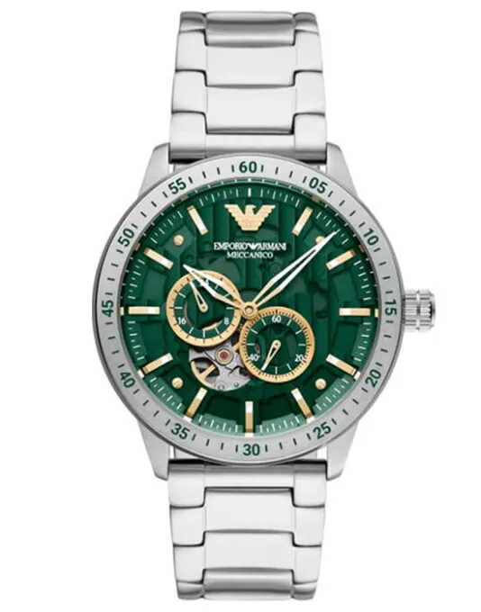Emporio Armani Mario AR60053 — воплощение итальянского стиля и любви к визуальным эффектам. Стальной корпус обрамляет насыщенный зеленый циферблат с эффектом градиента, в центре которого расположено окошко скелетона. Через него можно наблюдать за работой баланса и пружин, что в сочетании с полированным стальным браслетом создает образ дорогого аксессуара. Прозрачная задняя крышка дополняет этот индустриальный ансамбль, превращая часы в настоящий арт-объект.