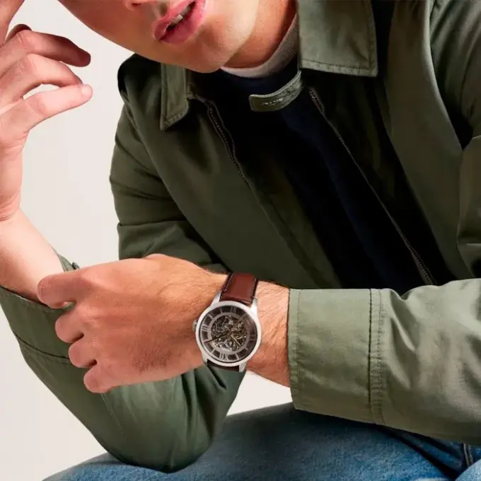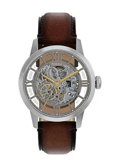 Fossil Townsman ME3270 — безусловный выбор тех, кто хочет максимальной открытости. По дизайну модель напоминает дорогущие скелетоны от Cartier или Piaget. Серебристый циферблат практически отсутствует, открывая взору сложное переплетение латунных и стальных деталей механизма. Сочетание холодного стального корпуса и мягкого коричневого кожаного ремешка придает часам благородный винтажный вид, который обычно характерен для премиальных изделий.