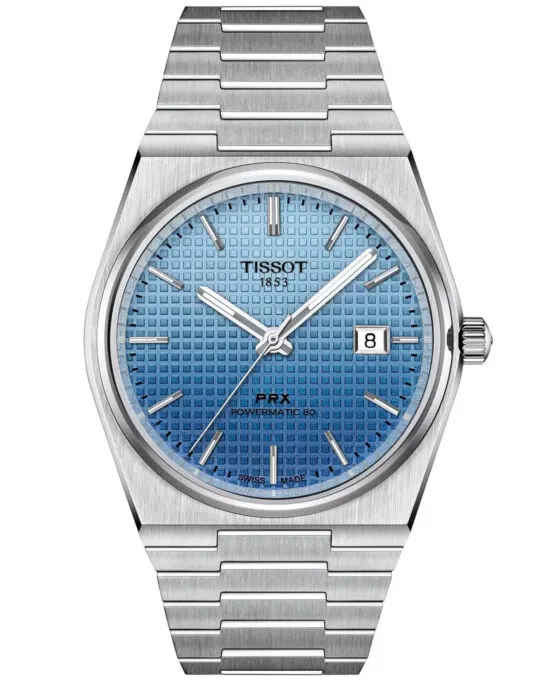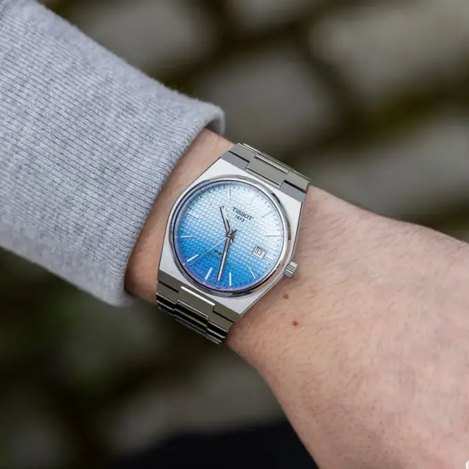 Перед нами современная легенда в нежно-голубом цвете Ice Blue — Tissot PRX Powermatic 80 T137.407.11.351.01. Стальной корпус с интегрированным браслетом и сатинированными поверхностями отсылает к иконам часового дизайна 70-х годов. Циферблат украшен рельефным узором Clous de Paris (парижские гвозди), который обычно встречается у брендов из «святой троицы» часового мира (Patek Philippe, Audemars Piguet и Vacheron Constantin). Тонкий профиль и игра света на гранях браслета создают ощущение аксессуара стоимостью в миллионы рублей.