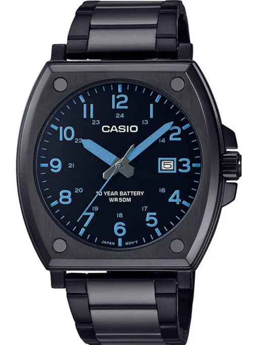 Casio Collection MTP-E715D-1A — отличный подарок для любителей брутального, но чистого дизайна. Стальной корпус и браслет с сатинированным покрытием придают часам особый характер. Чёрный циферблат с крупными накладными индексами и текстурой под асфальт защищён прочным минеральным стеклом. Ну, а главная особенность дизайна — массивная заводная головка.