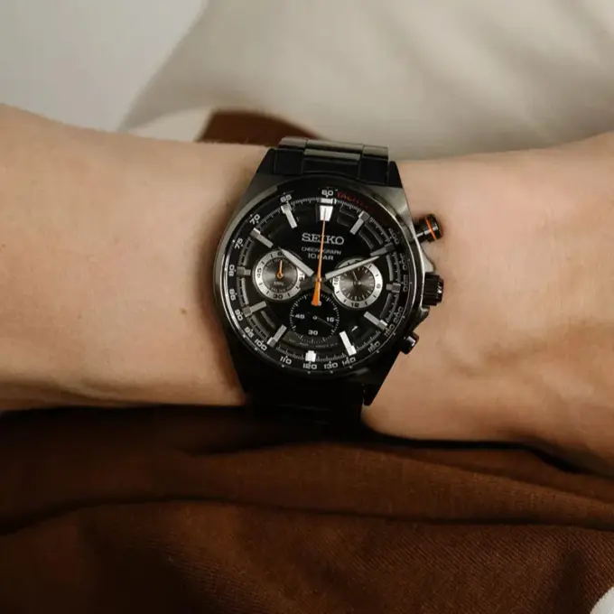 Seiko SSB399P1 — ещё одно воплощение японской функциональности и спортивного драйва. Полностью черный корпус и браслет с износостойким покрытием в сочетании с текстурированным карбоновым циферблатом создают образ скрытного хищника. Яркие цветовые акценты на секундной стрелке и шкалах хронографа добавляют динамики, а фирменное стекло Hardlex обеспечивает отличную защиту от ударов.