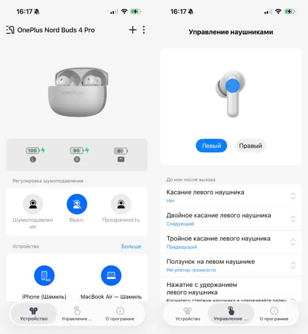 Из настроек звука выделим эквалайзер и технологию OnePlus 3D Audio для объёмного звучания. Также можно включить расслабляющие звуки или звуки для концентрации. А в разделе «Управление» есть все соответствующие настройки, причём настраивается каждый наушник по отдельности.