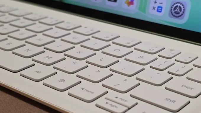 Нам досталась вариация с кейсом — он шикарный. Текстура близка к эко-коже, на ощупь очень приятная. Нижняя часть чехла откидывается и превращается в крайне удобную подставку. Клавиатуру можно отсоединить — она работает даже на расстоянии. К ее качеству ноль вопросов: клавиши прожимаются четко, мисскликов или залипаний нет. Печатать тексты на такой клаве — одно удовольствие.