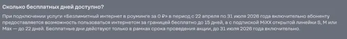 Оператор дает 15 дней пользования мобильным интернетом без абонентской платы для всех клиентов, и 22 дня — для подписчиков MiXX. В сутки дается 1 Гбайт трафика на высокой скорости, а затем скорость падает до 128 Кбит/с.