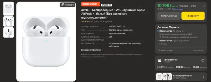 Прямо сейчас новые AirPods 4 (без шумоподавления) можно урвать на Яндекс Маркете за 10 798 рублей. А с кэшбеком некоторых банков покупка выйдет ещё выгоднее.