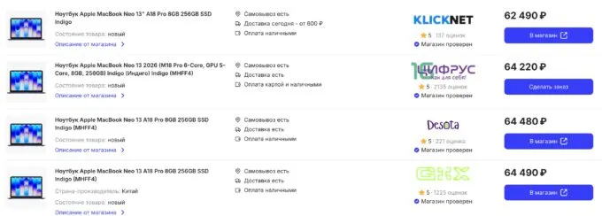 Коллеги из Hi-Tech Mail заметили, что самый дешевый макбук можно заказать от 60 тысяч рублей. Частично подтверждаем: на агрегаторе Price.ru мы нашли несколько предложений от 63 косарей. Для сравнения, на Маркете MacBook Neo пока стоит минимум 73 тысячи рублей.