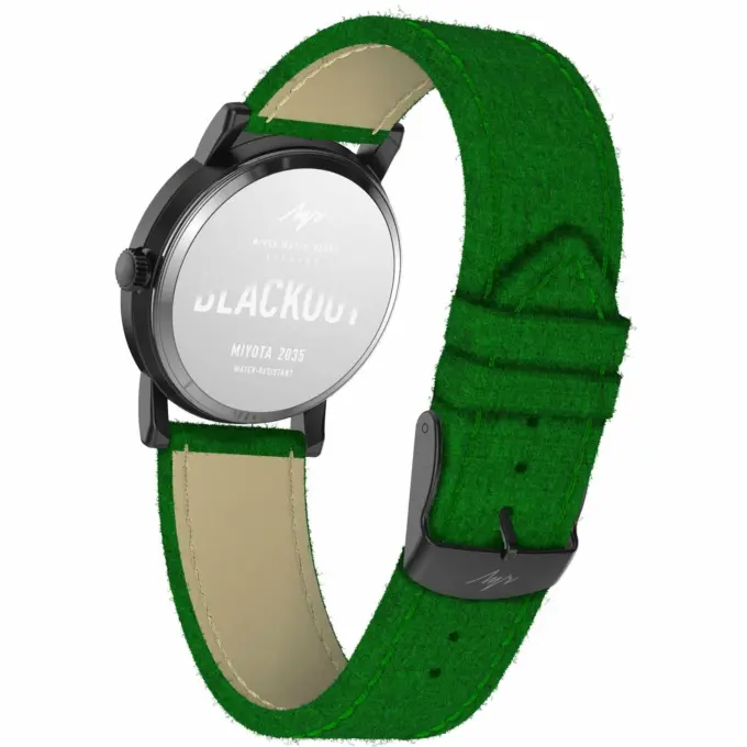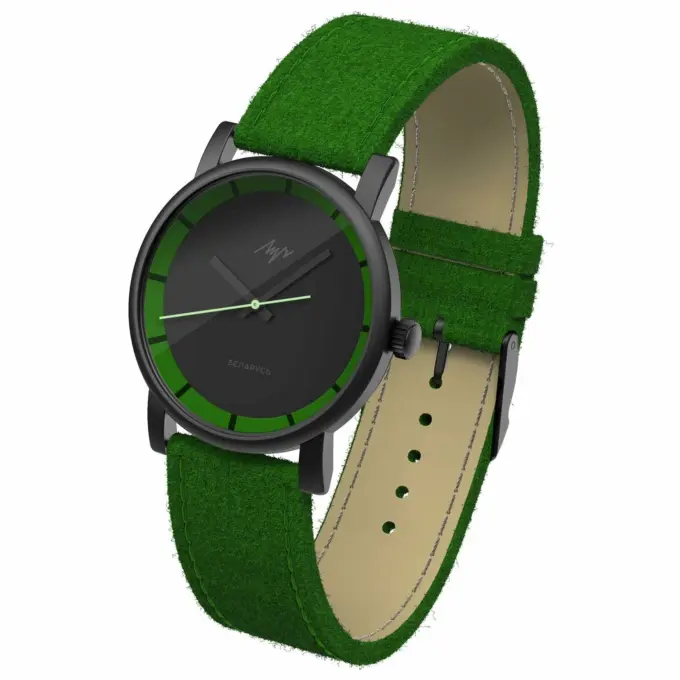 Луч BlackOut 2.0 (778449723) — максимально минималистичные часы с глубоким чёрным циферблатом, чёрными стрелками и яркими зелёными акцентами. Корпус модели сделан из стали с износостойким PVD-покрытием. На циферблате расположены метки в едином тёмном тоне, а сверху всё прикрыто прочным минеральным стеклом. Завершает образ плотный текстильный ремешок из войлока в насыщенном зелёном цвете с текстурой под газон.