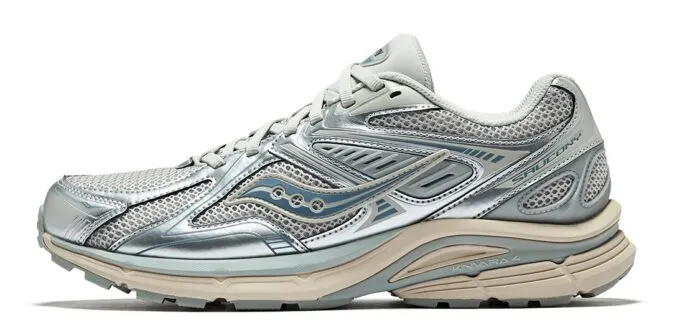 Куда же без массивной обуви из категории dad shoes, невероятно популярной в современном мире моды? Перед вами серебристые Kinvara 4 с дышащим текстильным верхом и брутальной подошвой с цепким протектором. По сути, это замена New Balance 530, которые сейчас носят практически все.