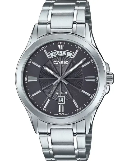 Модель Casio Collection MTP-1381D-8A подкупает своей функциональностью и сложной палитрой. Графитовый циферблат с текстурой Sunray в стальном обрамлении выглядит очень сдержанно и при этом дорого. Главная фича дизайна — отдельное дугообразное окно дня недели в верхней части циферблата, что обычно встречается в более дорогих сегментах за 50+ тысяч рублей. Защитные наплывы вокруг заводной головки добавляют корпусу визуальной мощи и надёжности.