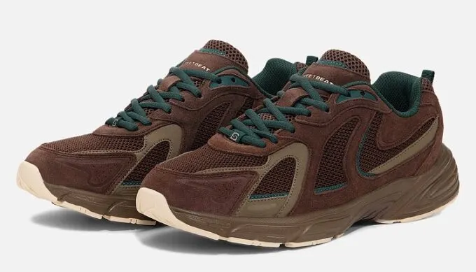 Начнем с коричнево-зеленых кроссовок River. Это модель с амортизирующей ЭВА-межподошвой и верхом из сетчатого текстиля и натуральной замши. Такое сочетание обеспечивает роскошную воздухопроницаемость и износостойкость. Дизайн и силуэт кроссовок отсылают нас к ретро-моделям с массивной подошвой.