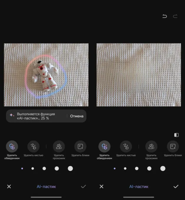 Помимо этого отметим, что в стоковом приложении «Камера» есть полезная ИИ-функциональность. Есть как ластик для редактирования (можно удалять с кадров лишние объекты), так и AI-расширение (достраивается картинка за пределами кадра), AI-апскейл (для улучшения чёткости) и функция открытия глаз на портретах.