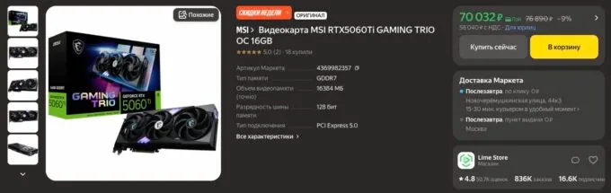 Что по спекам? Карта MSI RTX 5060 Ti Gaming Trio OC работает на частоте до 2662 МГц в режиме Extreme Performance, а лимит мощности в 180 Вт делает её довольно энергоэффективной. Большой и мощный блок питания для неё не нужен. Разумеется, тут есть поддержка DLSS 4.5 с технологией Multi Frame Generation, благодаря чему она выдает стабильные 100+ FPS в 1440p в самых тяжёлых тайтлах вроде Cyberpunk 2077: Phantom Liberty. Металлический бэкплейт и премиальная компонентная база MSI Gaming Trio гарантируют, что карта не прогнется и не перегреется даже после 10-часового марафона. Это ультимативный выбор для комфортного гейминга с заделом на будущее.