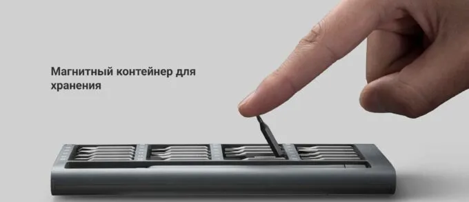 Xiaomi Mi Precision Screwdriver Kit — идеальный набор для тонких работ, в котором производитель сделал ставку на качество стали и минимализм. В комплекте идет лаконичный кейс из анодированного алюминия с приятным механизмом. Достаточно нажать на верхнюю грань, чтобы внутренний пенал плавно выехал из него. Дизайн максимально эстетичный: матовый серый металл, скругленные грани и никаких лишних защелок. Благодаря магнитному держателю внутри органайзера, все 24 биты четко сидят на своих местах и не разлетаются, даже если вы случайно перевернете открытый набор. При этом он выглядит как премиальный аксессуар и почти не занимает места на рабочем столе.