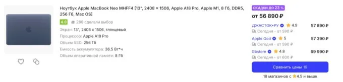 На Маркете MacBook Neo стоит 65 тысяч рублей — то есть на уровне Air на процессоре M1. Это терпимо, но все еще дорого. Зато на агрегаторе Price.ru мы нашли новые лэптопы за 57 тысяч рублей.