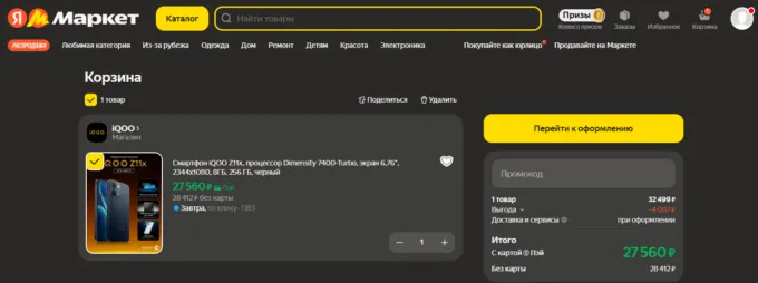 Что по цене? Сейчас iQOO Z11x можно приобрести на Яндекс.Маркете всего от 28 412 рублей. Напоминаем, что прайс актуален именно для Москвы — если вы находитесь в другом городе нужно переключиться на столицу и проверить, можно ли оформить доставку.