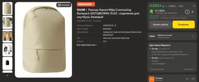 Прямо сейчас лучший городской рюкзак Xiaomi Mijia Commuting Backpack можно урвать на Яндекс Маркете всего за 4883 рубля. А с кэшбеком некоторых банков покупка обойдется еще выгоднее.